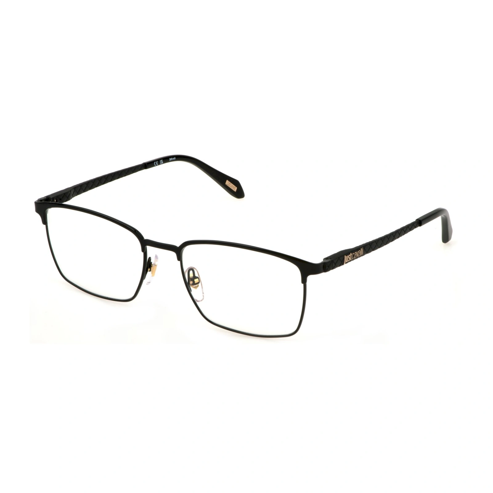 Just Cavalli VJC058 dioptrijski okvir – elegantan full-rim metalni square model (55 / 18 / 145 mm), u bojama rose gold/black, crna i gun/green; sofisticiran, izdržljiv i stilski izbor.